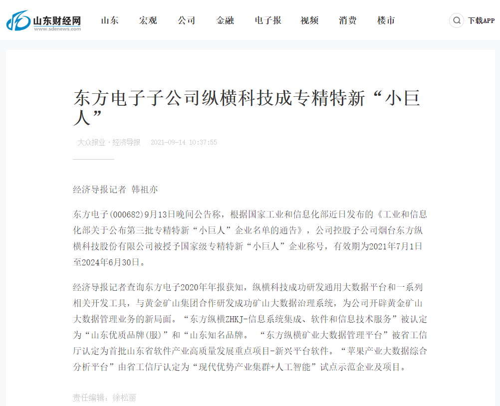 东方电子旗下烟台东方纵横科技股份有限公司荣获专精特新“小巨人”企业称号