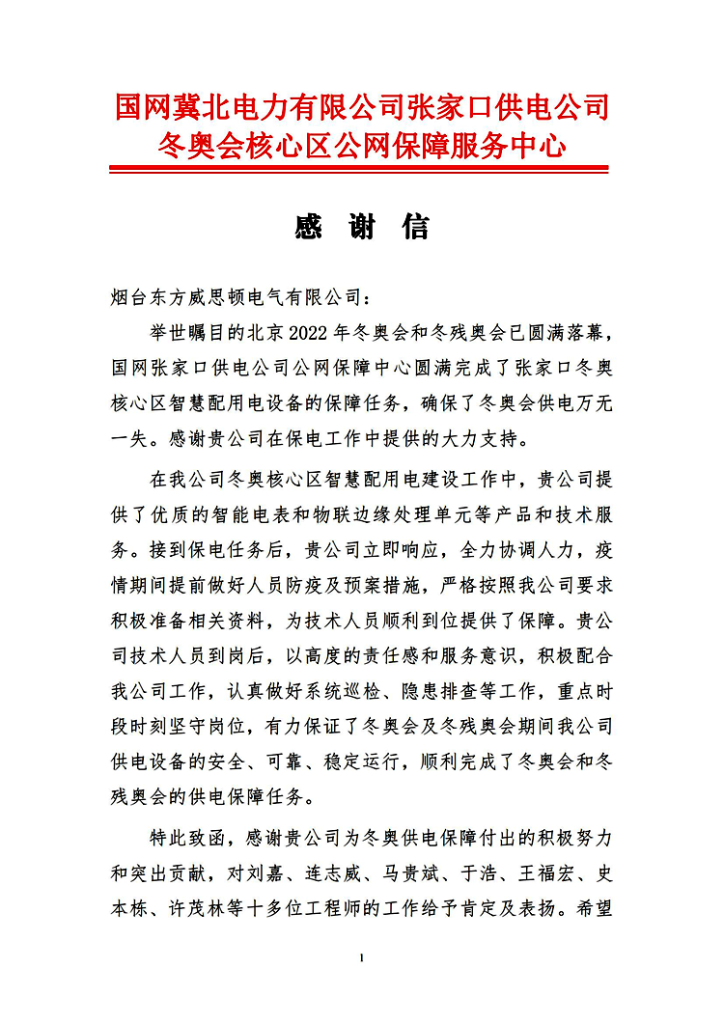 本次奥运保电周期长且交叉春节、保电范围广、要求高、环境复杂,同时受新冠疫情的影响,给项目实施带来的任务之重、挑战之多前所未有。威思顿上下高度重视,高标准起步、高质量推进,提前半年早布置、早安排,对项目筹划到方案设计,产品封闭开发、测试、交付到现场调试、运行维护等各环节严格把控;同时,威思顿十余位业务精英春节期间留守现场,认真做好系统巡检、隐患排查等工作,整个赛事期间实现设备零故障、客户零闪动、工作零差错、服务零投诉,有力保障了冬奥会及冬残奥会期间供电设备的安全、可靠、稳定运行,得到了国网冀北电力有限公司、电力设备总包方等单位的一致好评,国网冀北电力有限公司张家口供电公司及冬奥会核心区公网保障服务中心寄来感谢信。