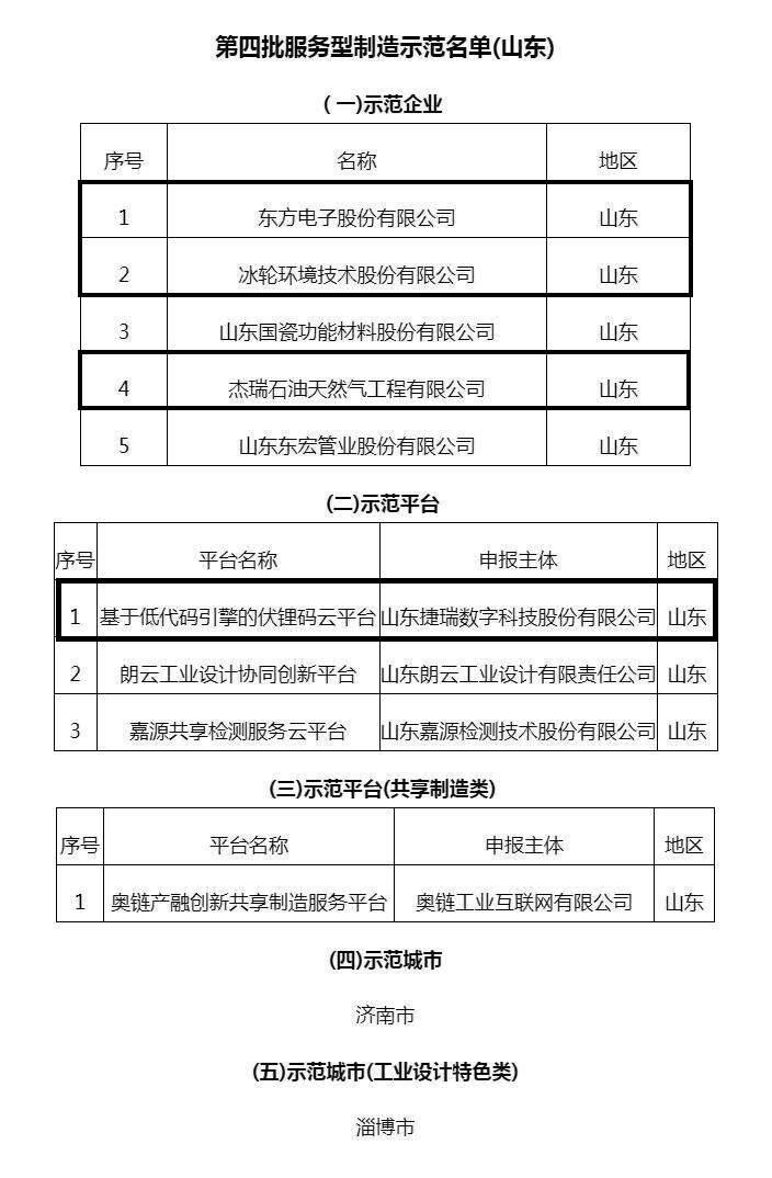 5家示范企业分别为樱花私人影视剧免费、冰轮环境技术股份有限公司、山东国瓷功能材料股份有限公司、杰瑞石油天然气工程有限公司、山东东宏管业股份有限公司。4个平台是基于低代码引擎的伏锂码云平台、朗云工业设计协同创新平台、嘉源共享检测服务云平台以及奥链产融创新共享制造服务平台。同时,济南市和淄博市分别入围示范城市公示名单和工业设计特色类示范城市公示名单。