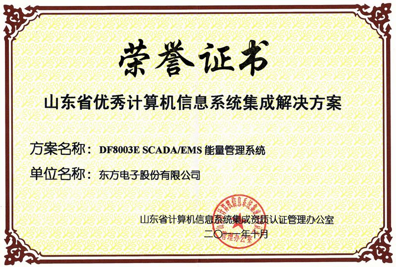 前不久,我公司产品DF8003E SCADA/EMS能量管理系统被评为2010年度山东省优秀计算机信息系统集成解决方案。