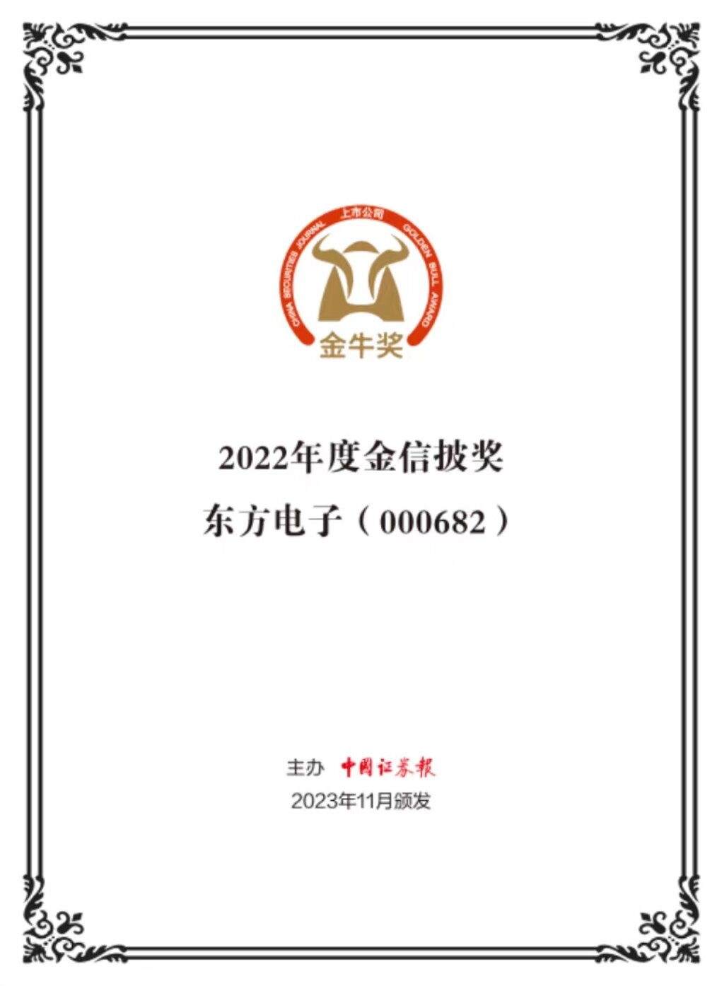11月23日,在中国证券报、南通市人民政府联合主办的2023上市公司高质量发展论坛暨第二十五届上市公司金牛奖颁奖典礼上,东方电子凭借在信息披露、投资者关系管理等方面的优异表现,荣获“第二十五届上市公司金信披奖”。