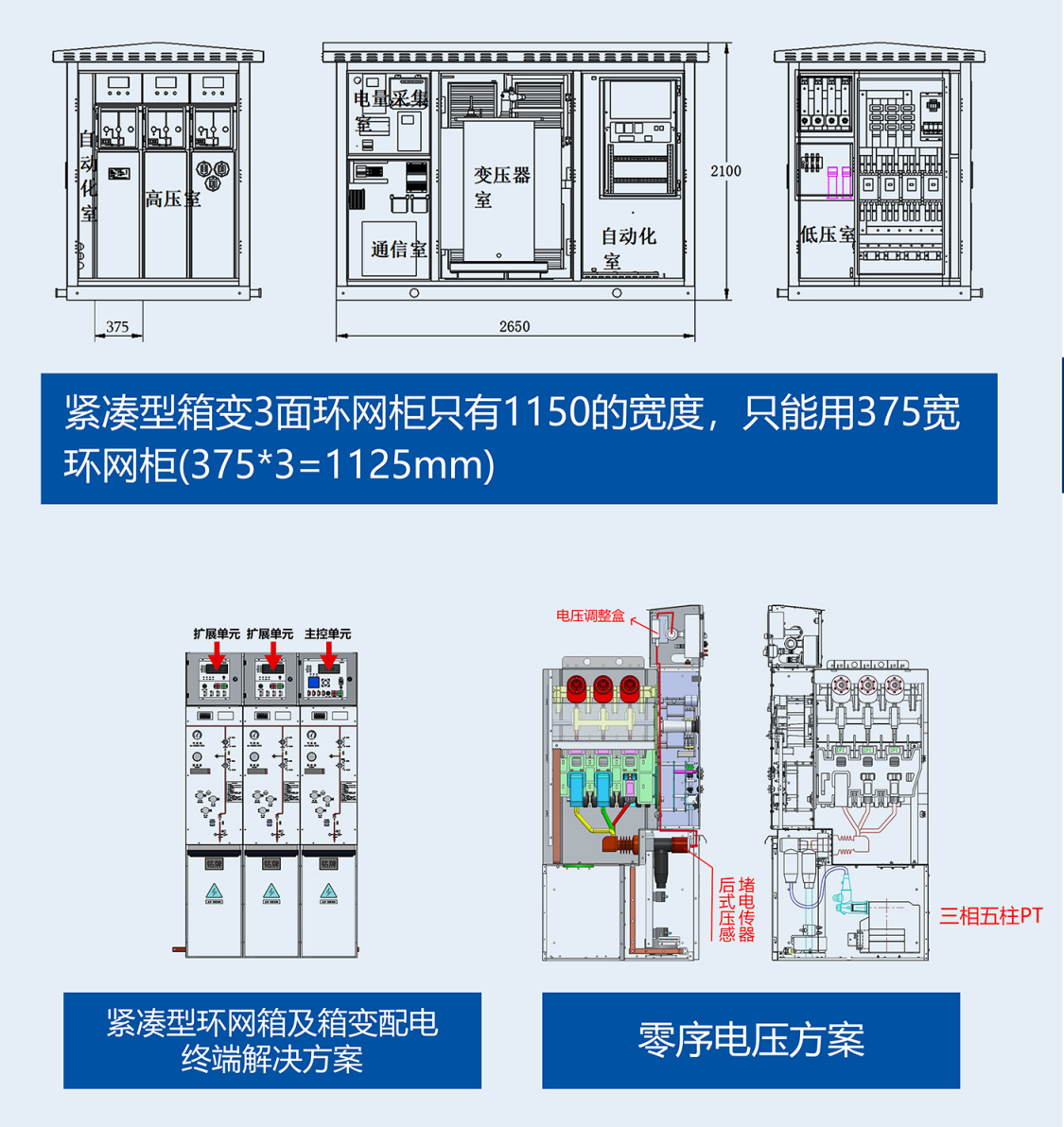 箱变和紧凑型环网箱配电终端按1主控单元+N扩展单元的分散安装模式设计,一个产品满足多个应用场景。增加非电量保护、反时限保护用于箱变场景。方案具有集成防跳、分合闸保持、分合闸操作等功能,采用模块化设计和前门运维方式,方便现场操作。