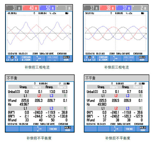 E5011-SPO谐波补偿能有效滤除负载3、5、7、9、11等特征次谐波,在补偿功率因数、三相不平衡的同时对特征次谐波有良好的滤除作用,补偿前后滤波效果对比见图: