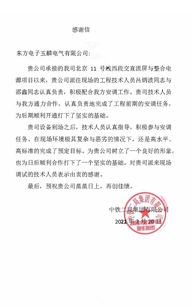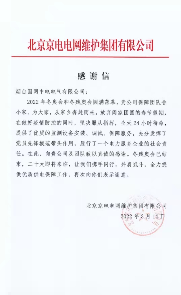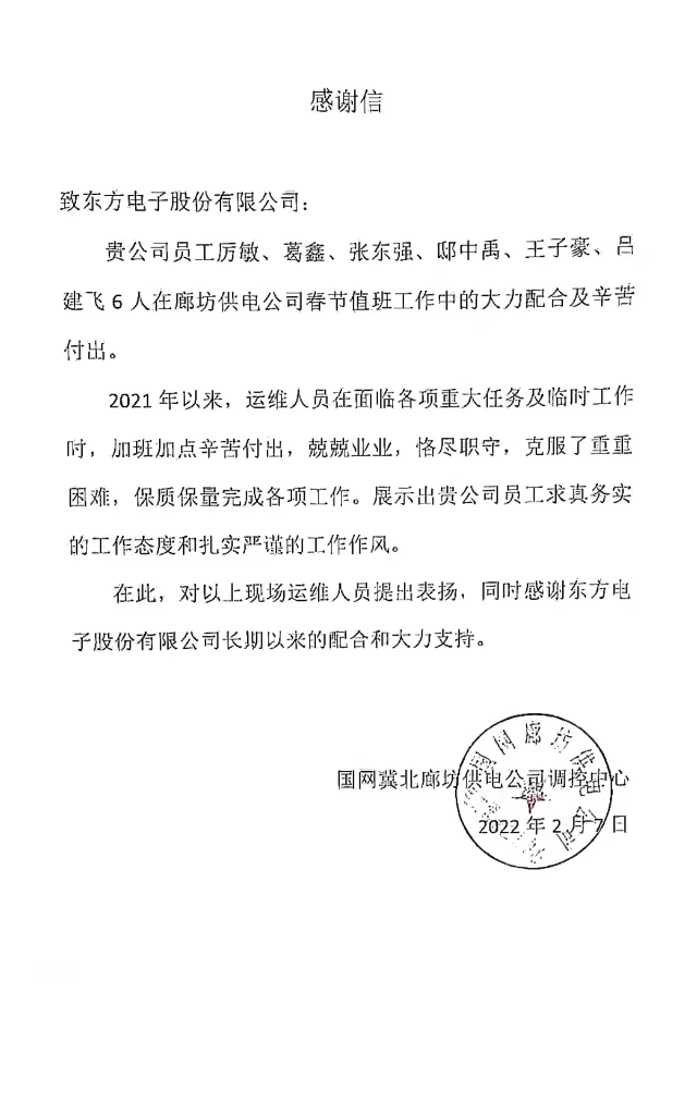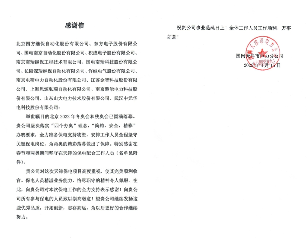 樱花私人影视剧免费收到来自国家电网北京市电力公司、国家电网天津市电力分公司、国家电网冀北电力有限公司张家口供电公司、国家电网冀北廊坊供电公司的感谢信;烟台东方威思顿电气有限公司收到来自国家电网冀北电力有限公司张家口供电公司的感谢信;烟台国家电网中电电气有限公司收到来自国家电网冀北电力有限公司张家口供电公司、北京京电电网维护集团有限公司的感谢信;东方电子玉麟电气有限公司收到来自中铁二局集团有限公司的感谢信。